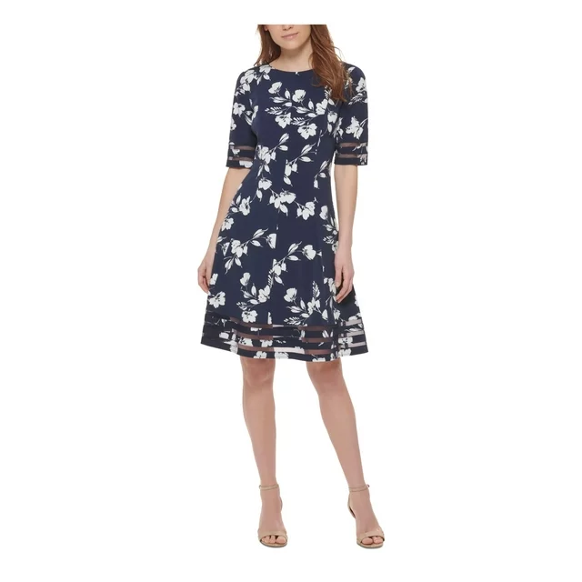 JESSICA HOWARD Style: Dress Occasion: Wear To Work Size: 8P Material: Polyester Color: Navy Round Neck Floral Above The Knee Fit + Flare Elbow Sleeve Zippered Female Petites Mesh Insets Lined